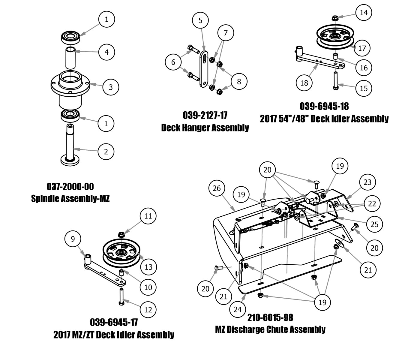 Spindle, Deck Hanger, Deck Idler, Discharge Chute Assembly