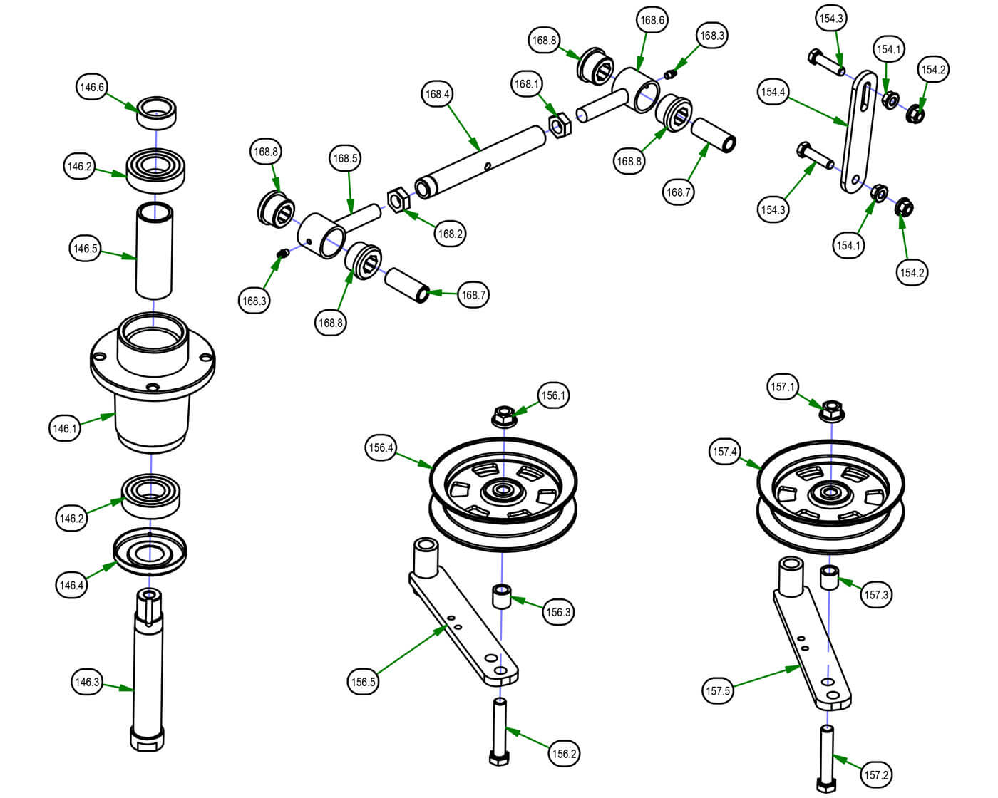 Deck Sub Assemblies - Spindle, Deck Hanger, Deck Idler, Turnbuckle